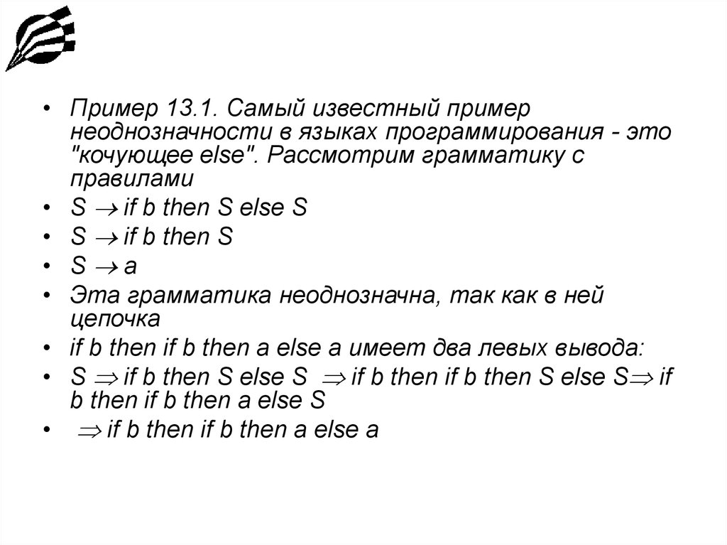 • Пример 13.1. Самый известный примернеоднозначности в языках программирования - это