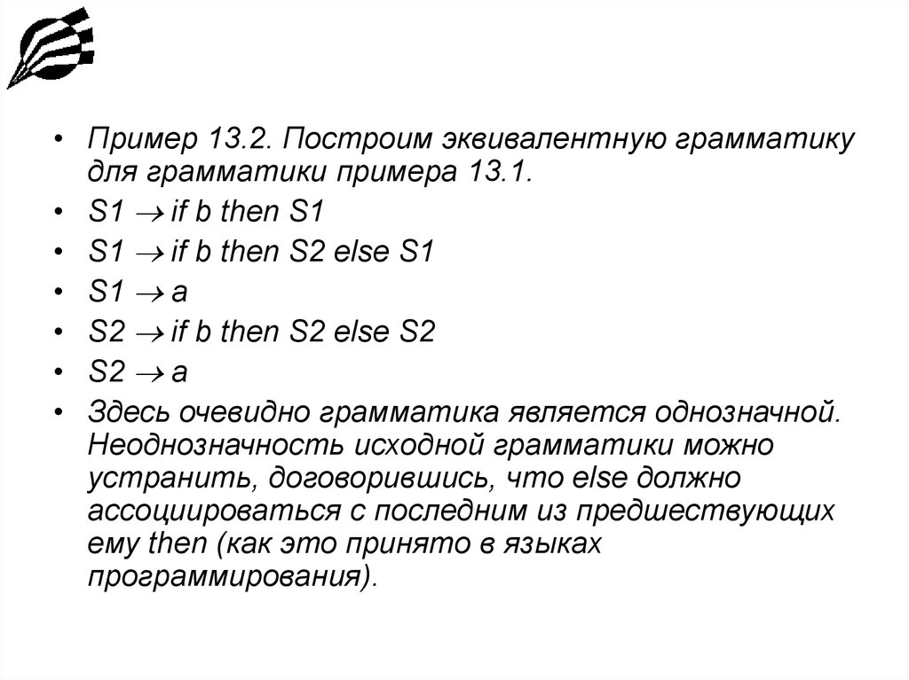 • Пример 13.2. Построим эквивалентную грамматикудля грамматики примера 13.1.