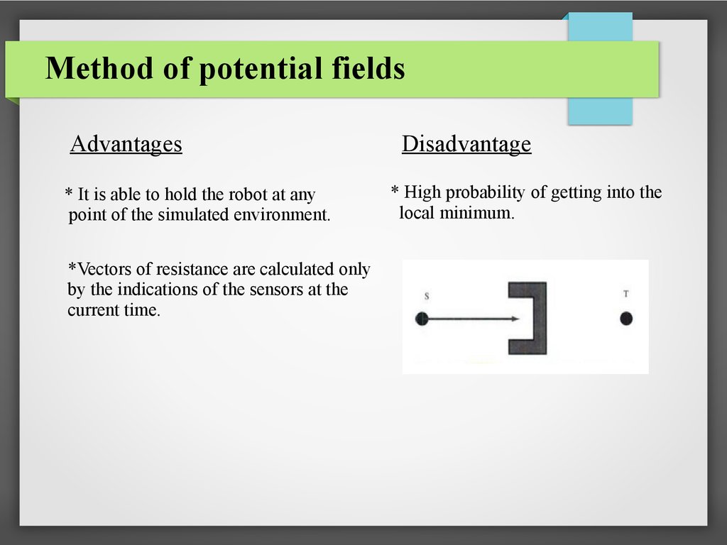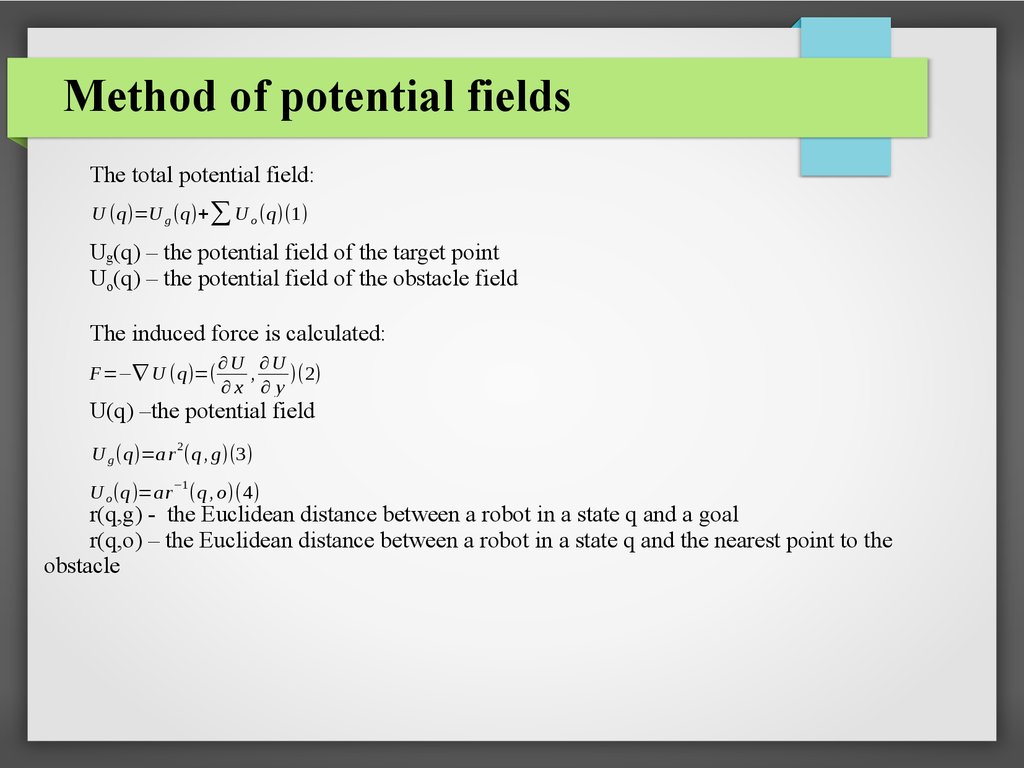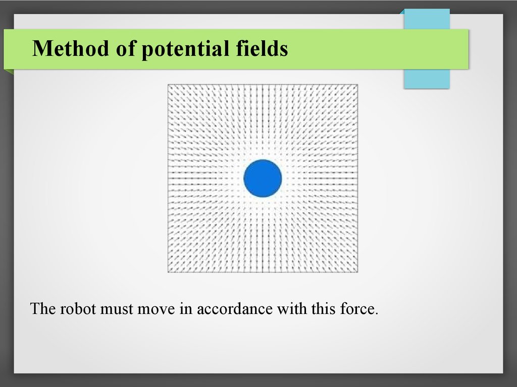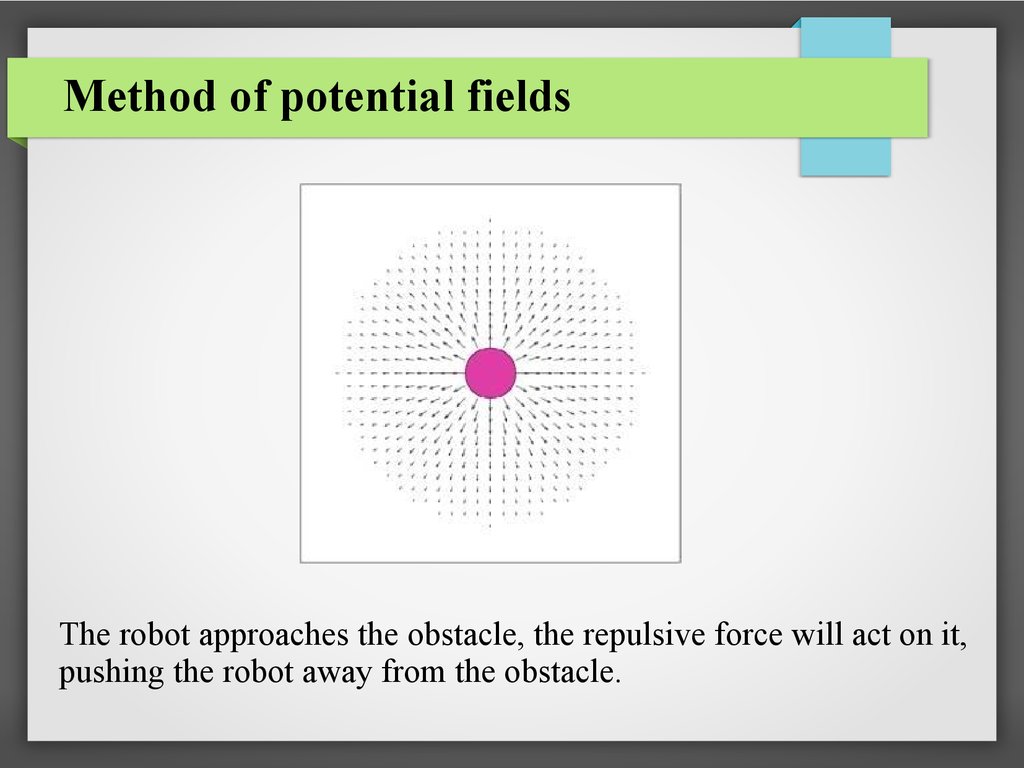Method of potential fieldsThe robot approaches the obstacle, the repulsive force will act on it,