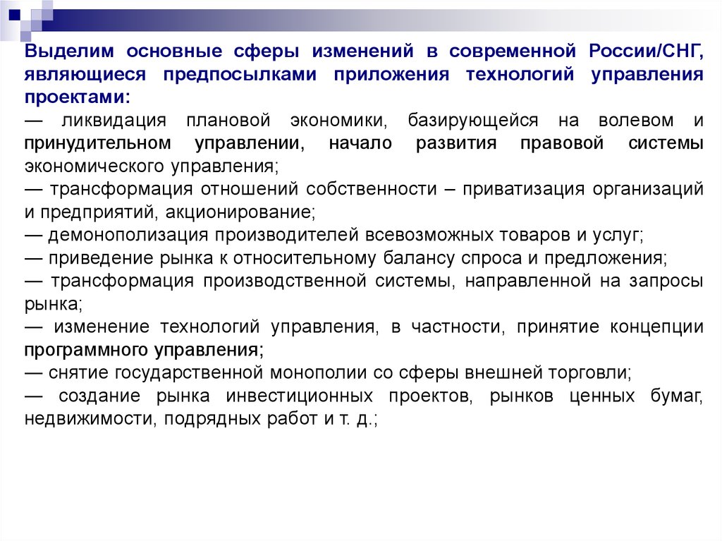 Выделим основные сферы изменений в современной России/СНГ,являющиеся предпосылками приложения технологий управления
