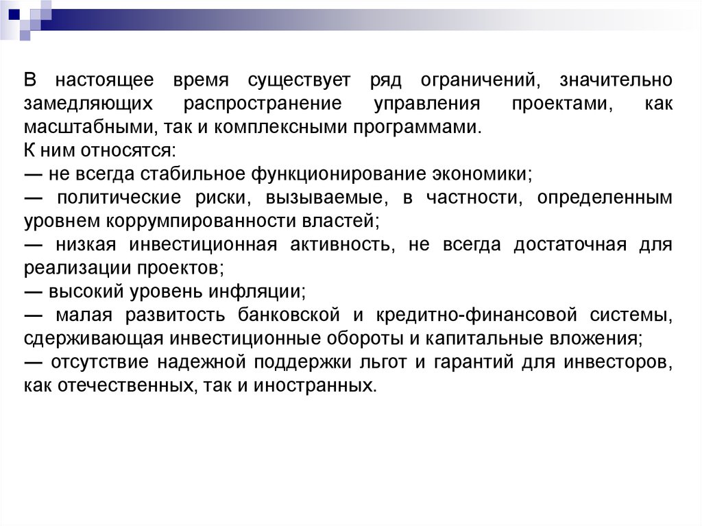 В настоящее время существует ряд ограничений, значительнозамедляющих