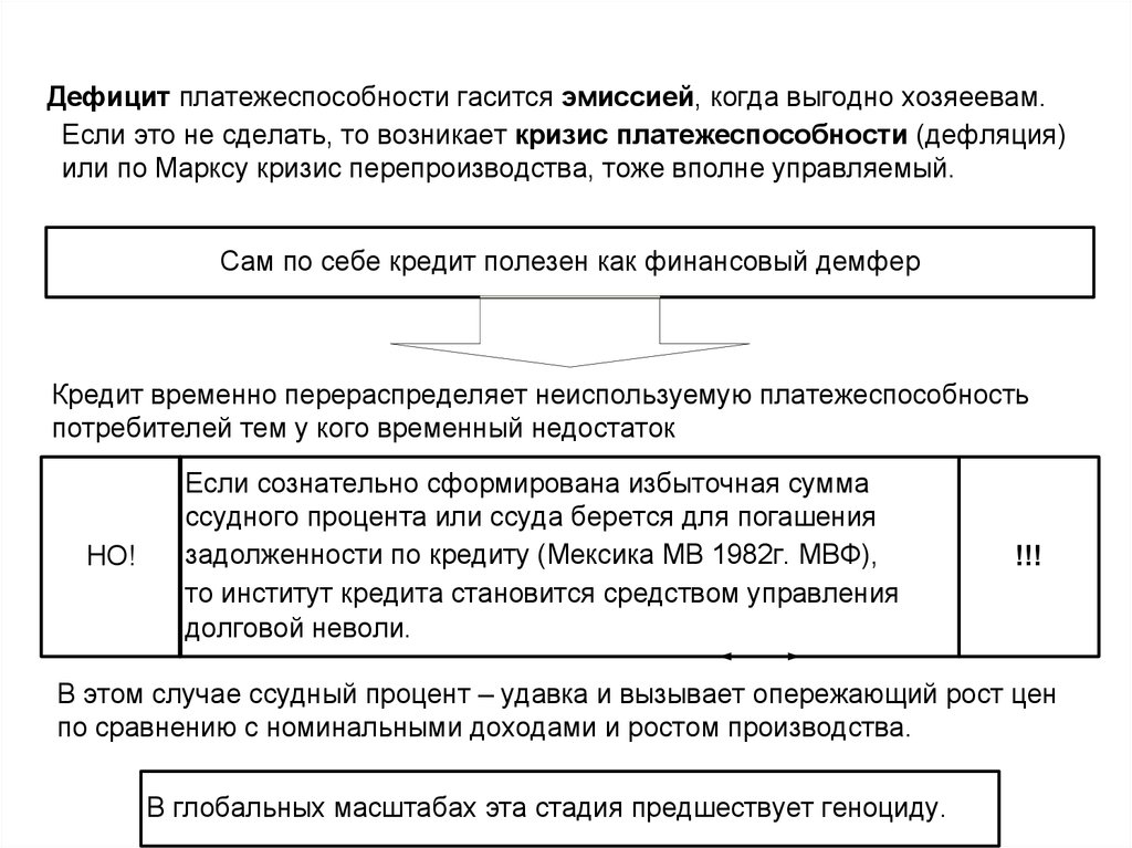 Дефицит платежеспособности гасится эмиссией, когда выгодно хозяеевам.Если это не сделать, то возникает кризис платежеспособности (дефляция)