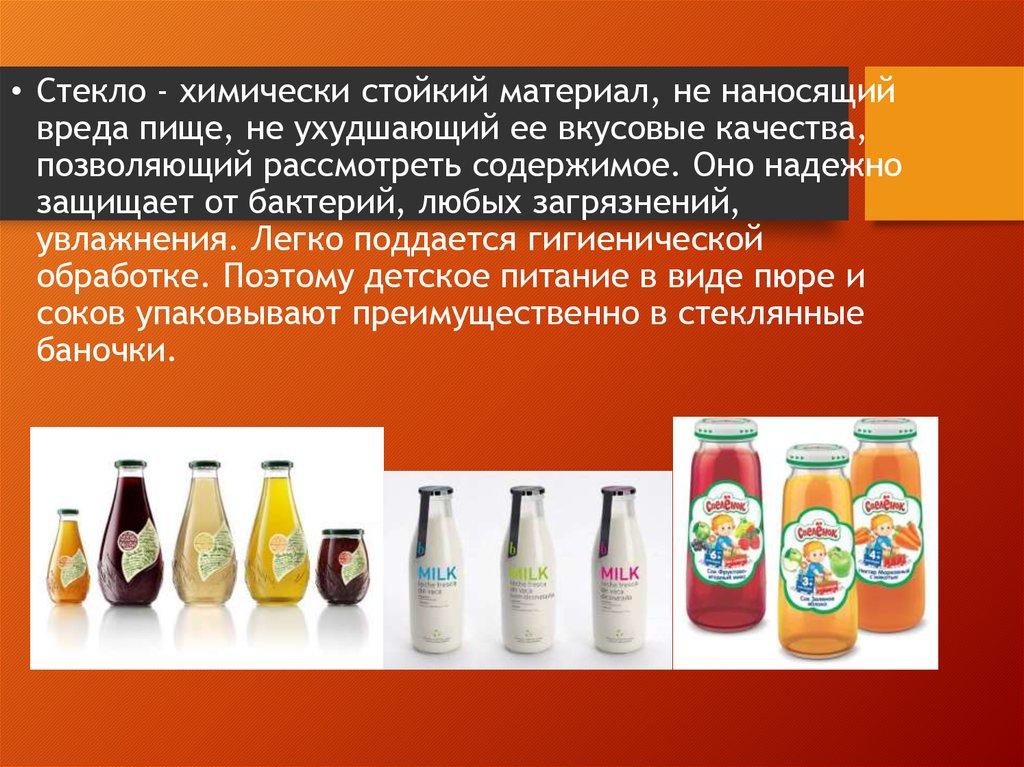 • Стекло - химически стойкий материал, не наносящийвреда пище, не ухудшающий ее вкусовые качества,