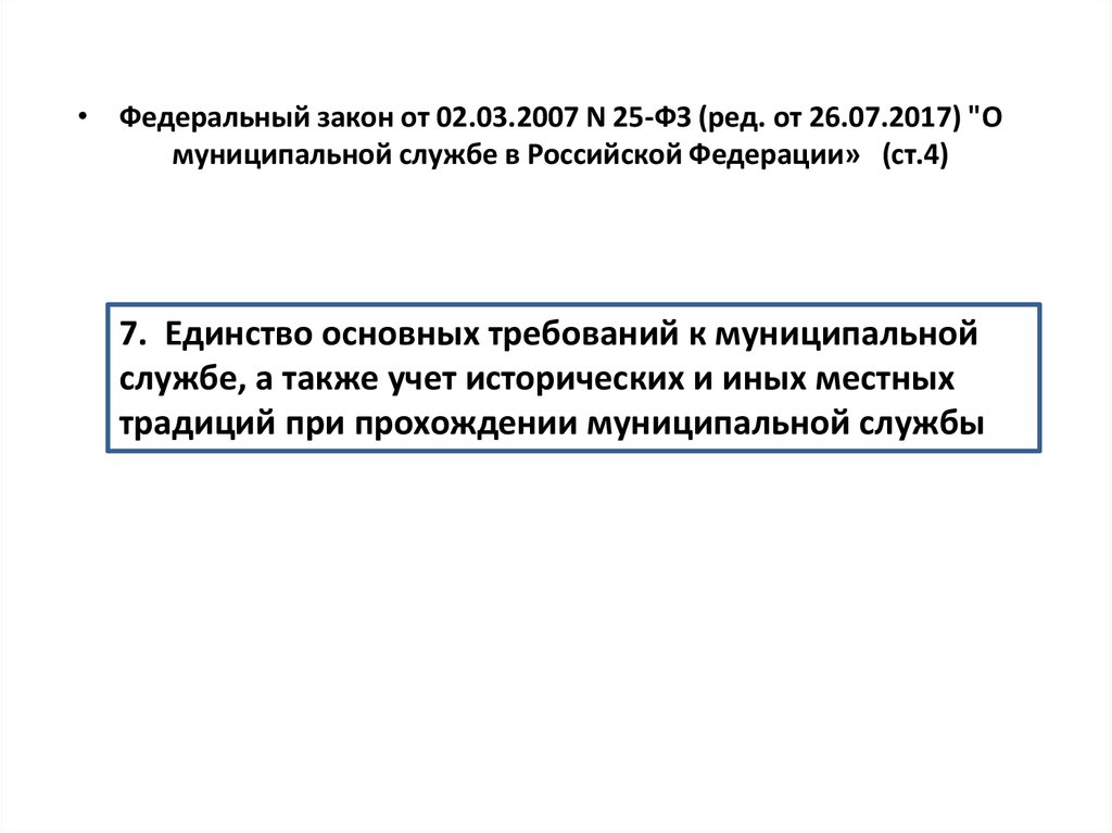 • Федеральный закон от 02.03.2007 N 25-ФЗ (ред. от 26.07.2017) "Омуниципальной службе в Российской Федерации» (ст.4)