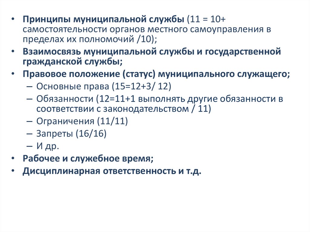 • Принципы муниципальной службы (11 = 10+самостоятельности органов местного самоуправления в