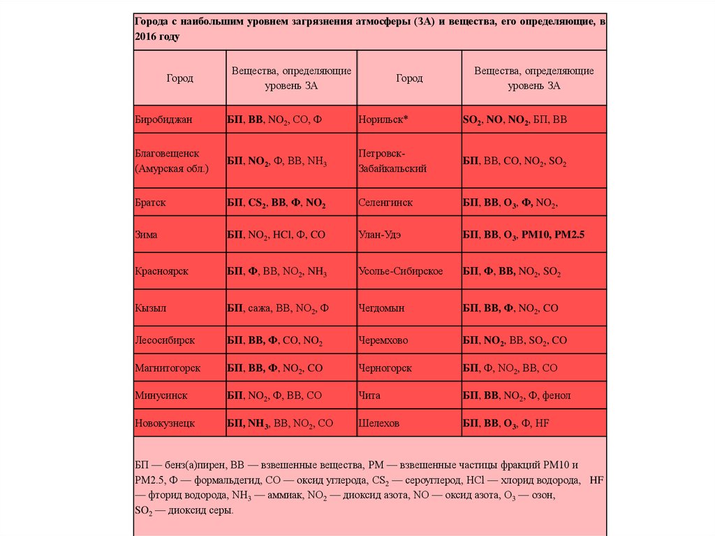 Города с наибольшим уровнем загрязнения атмосферы (ЗА) и вещества, его определяющие, в2016 году