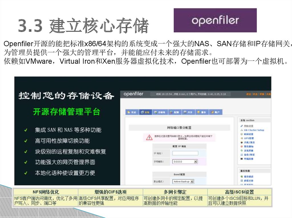 3.3 建立核心存储Openfiler开源的能把标准x86/64架构的系统变成一个强大的NAS、SAN存储和IP存储网关