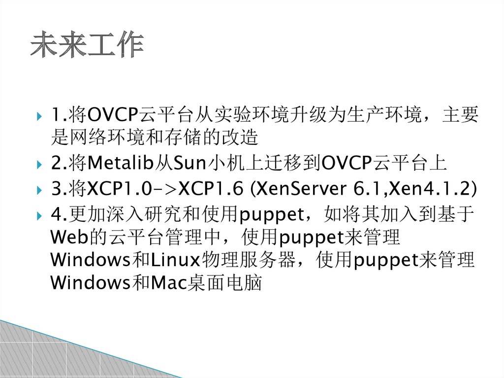 未来工作1.将OVCP云平台从实验环境升级为生产环境 主要