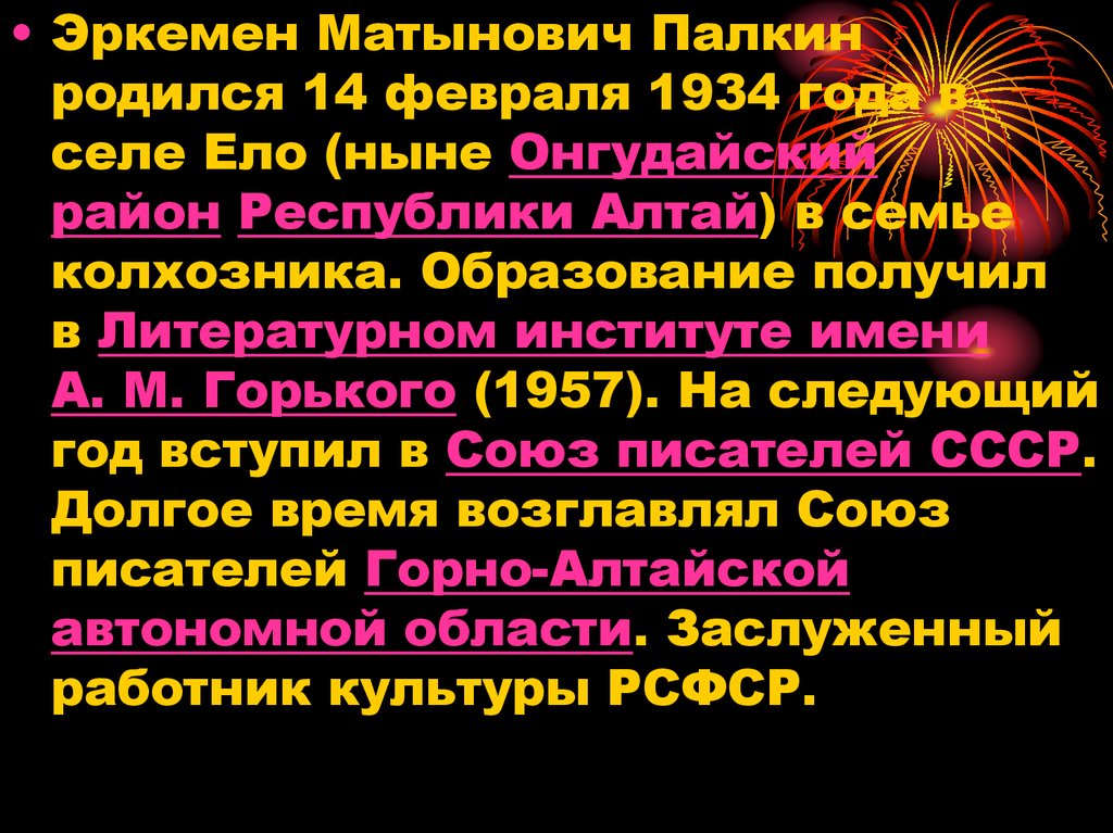 • Эркемен Матынович Палкинродился 14 февраля 1934 года в