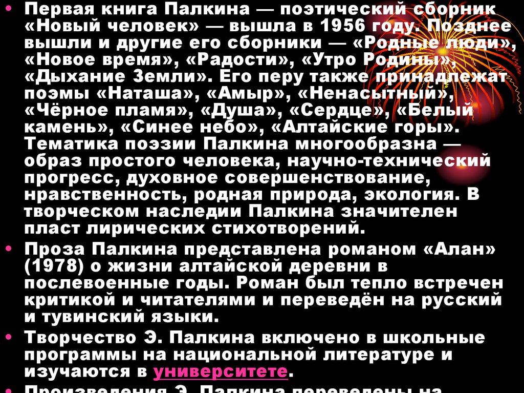 • Первая книга Палкина — поэтический сборник«Новый человек» — вышла в 1956 году. Позднее