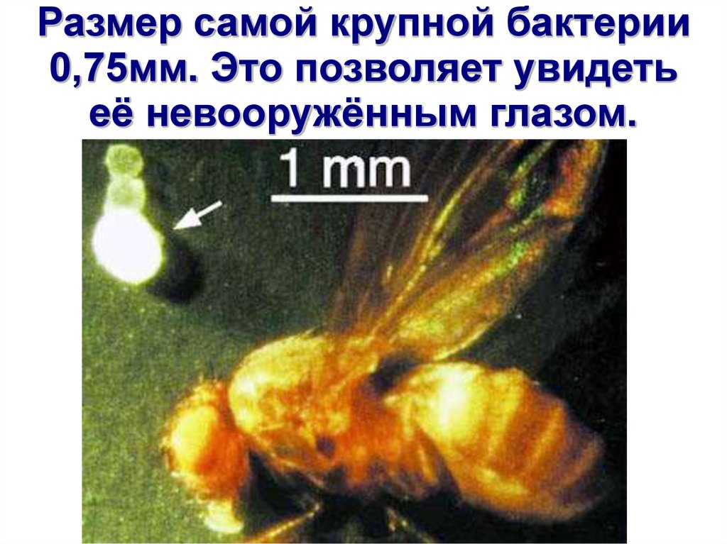Размер самой крупной бактерии0,75мм. Это позволяет увидеть