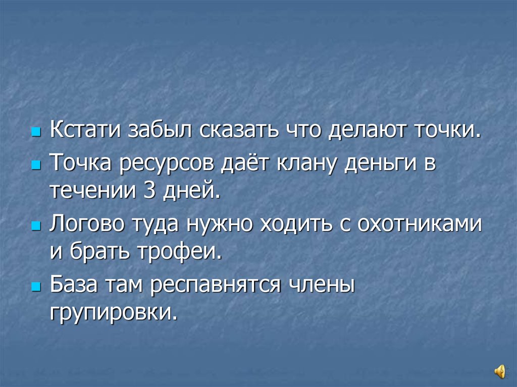 Кстати забыл сказать что делают точки.Точка ресурсов даёт клану деньги в