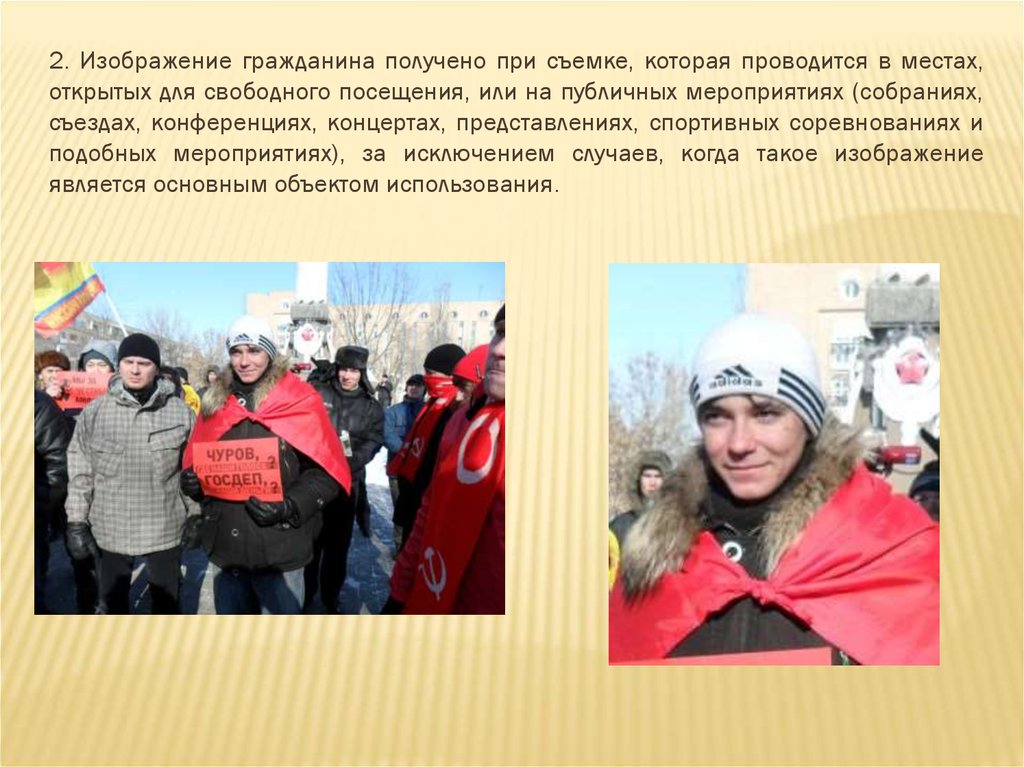 2. Изображение гражданина получено при съемке, которая проводится в местах,открытых для свободного посещения, или на публичных мероприятиях (собраниях,