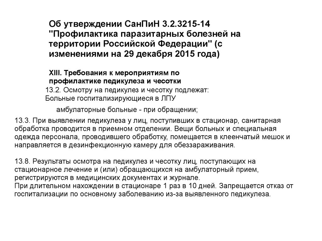 13.3. При выявлении педикулеза у лиц, поступивших в стационар, санитарная