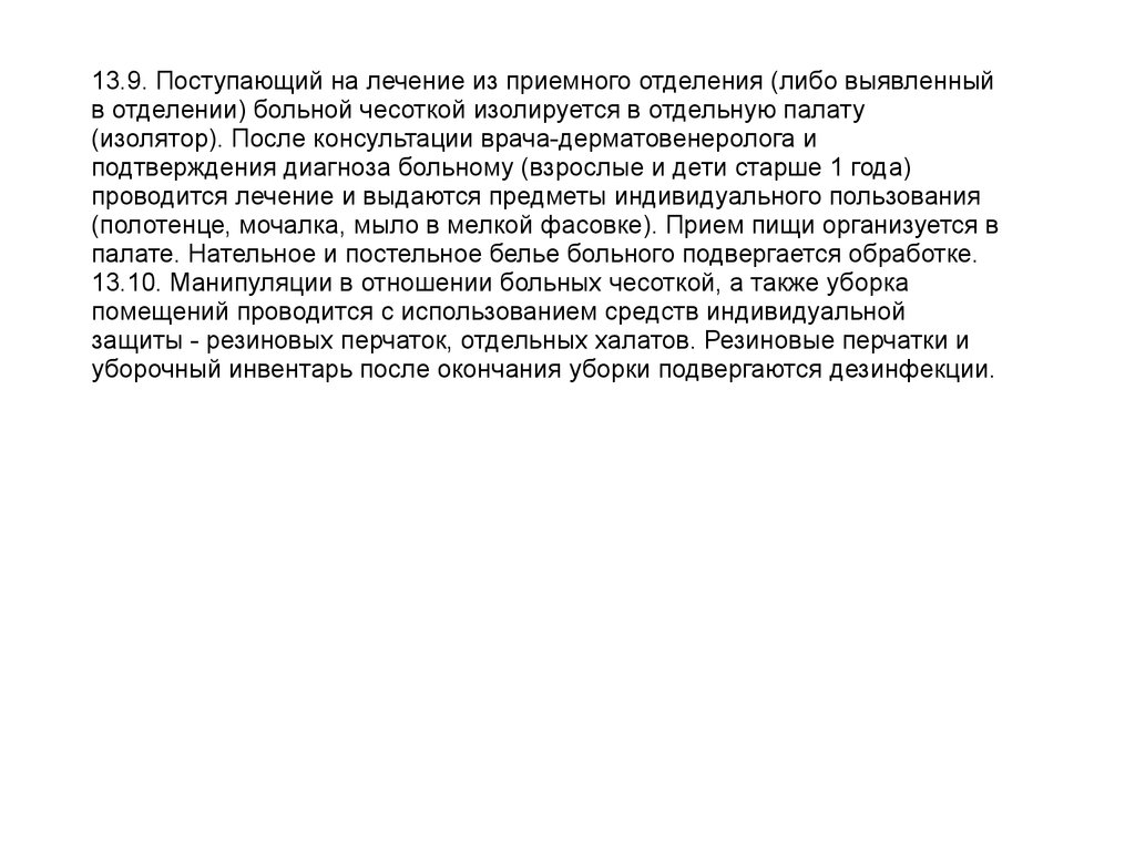 13.9. Поступающий на лечение из приемного отделения (либо выявленныйв отделении) больной чесоткой изолируется в отдельную палату