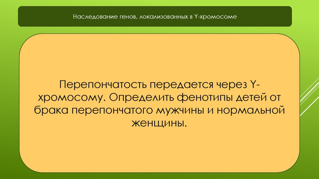 Наследование генов, локализованных в Y-хромосомеПерепончатость передается через Yхромосому. Определить фенотипы детей от