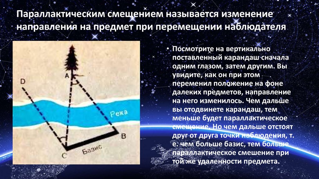 Параллактическим смещением называется изменениенаправления на предмет при перемещении наблюдателя
