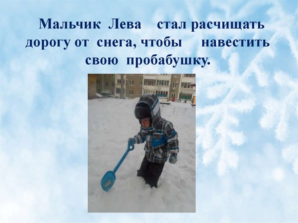 Мальчик Лева стал расчищатьдорогу от снега, чтобы навестить