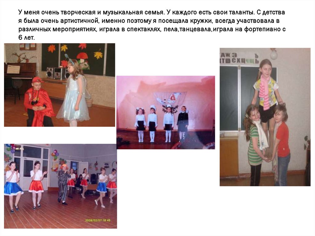 У меня очень творческая и музыкальная семья. У каждого есть свои таланты. С детствая была очень артистичной, именно поэтому я посещала кружки, всегда участвовала в