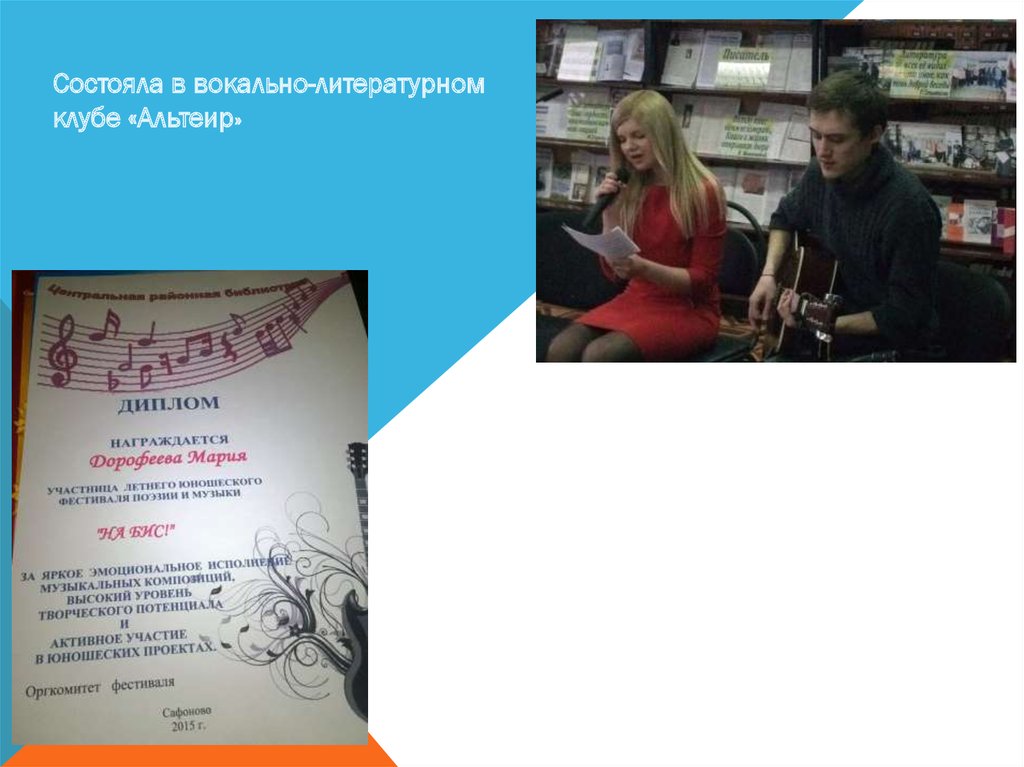 различных мероприятиях, играла в спектаклях, пела,танцевала,играла на фортепиано с