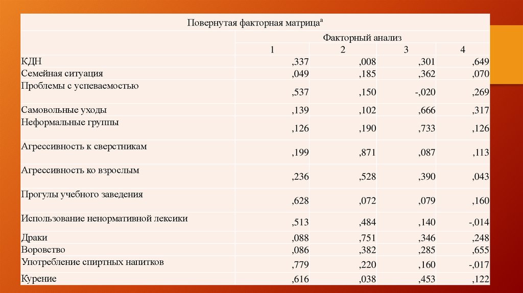 • Критерий согласия должен быть больше 0,05;• Повернутая факторная матрица отражает долю выраженности