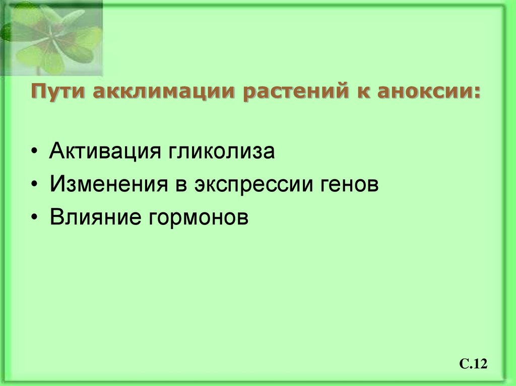 Пути акклимации растений к аноксии:• Активация гликолиза