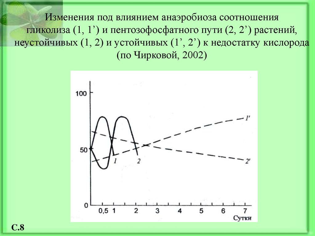 Изменения под влиянием анаэробиоза соотношениягликолиза (1, 1’) и пентозофосфатного пути (2, 2’) растений,
