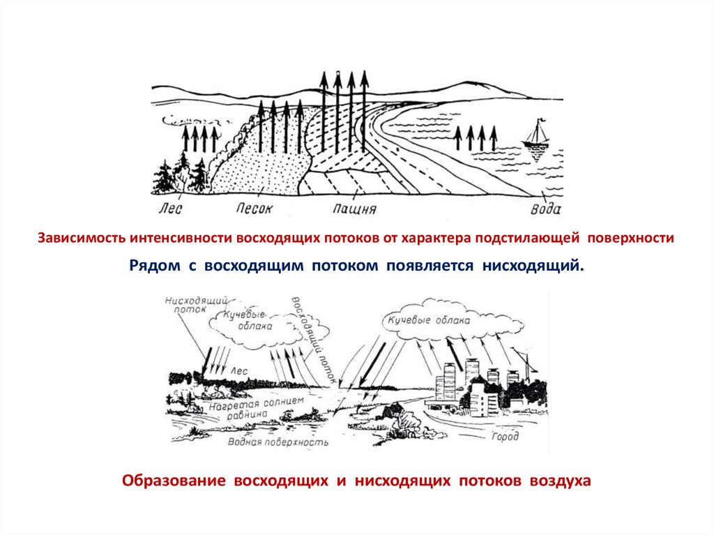 Зависимость интенсивности восходящих потоков от характера подстилающей поверхностиРядом с восходящим потоком появляется нисходящий.