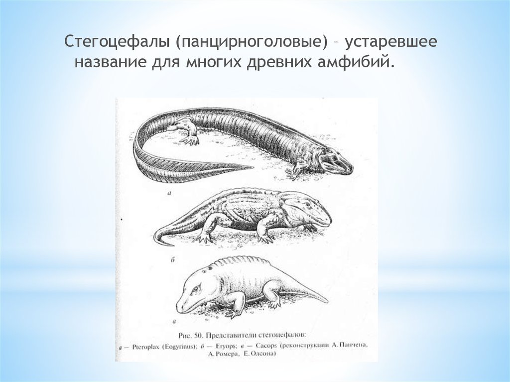 Стегоцефалы (панцирноголовые) – устаревшееназвание для многих древних амфибий.