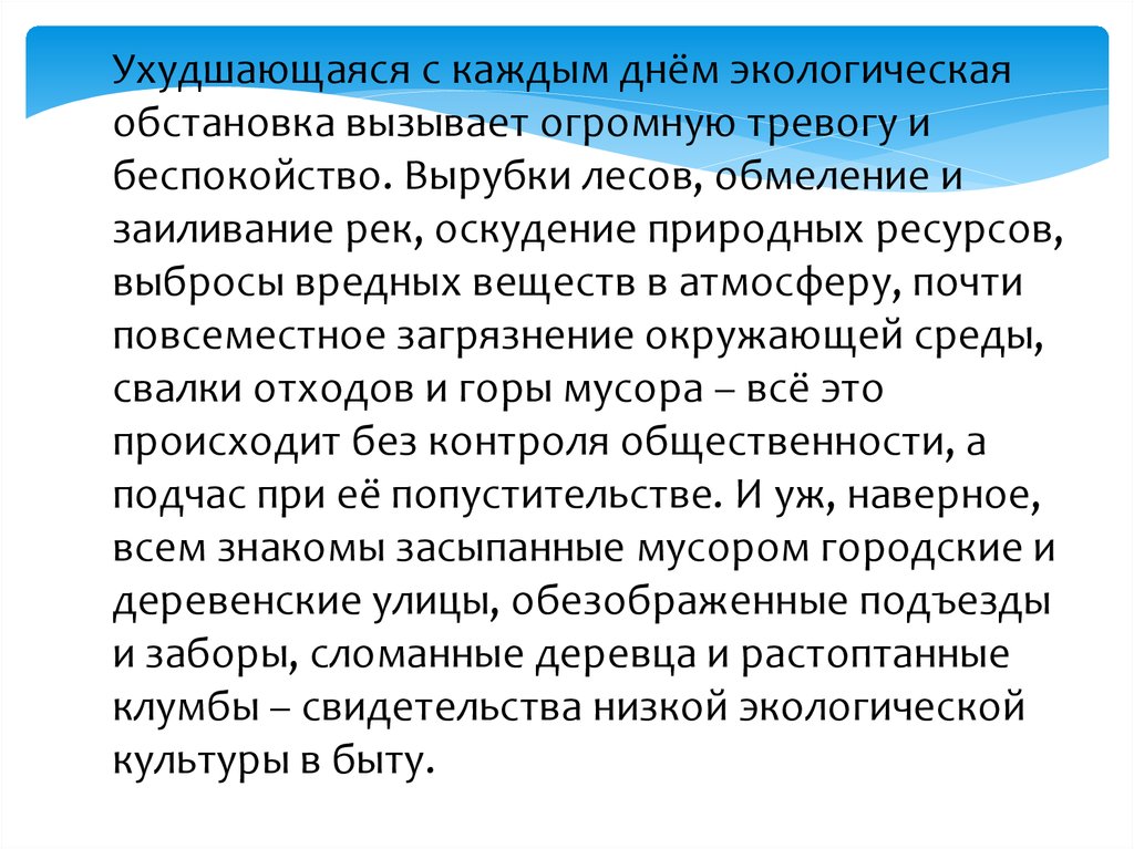Ухудшающаяся с каждым днём экологическаяобстановка вызывает огромную тревогу и