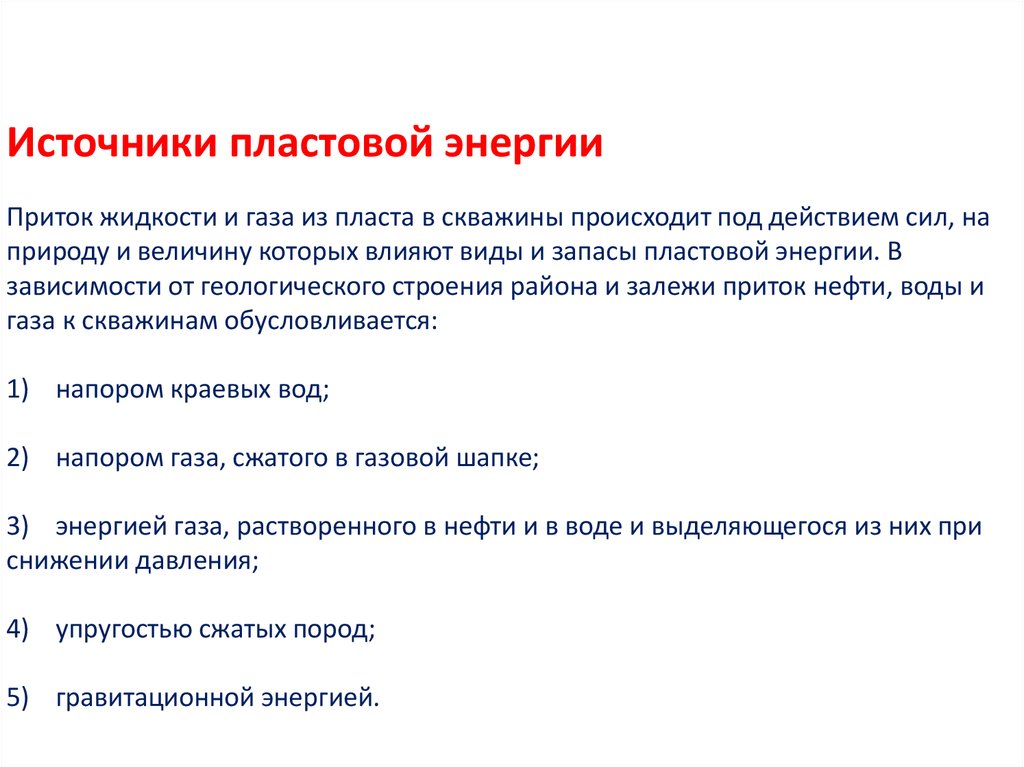 Источники пластовой энергииПриток жидкости и газа из пласта в скважины происходит под действием сил, на