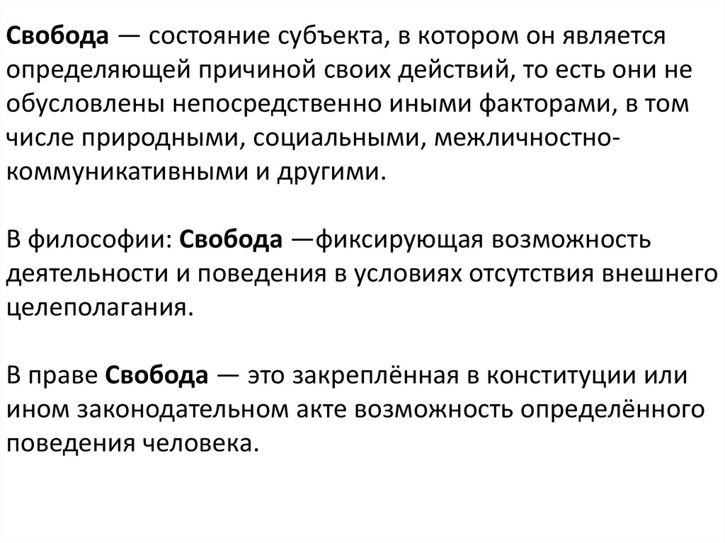 Свобода — состояние субъекта, в котором он являетсяопределяющей причиной своих действий, то есть они не