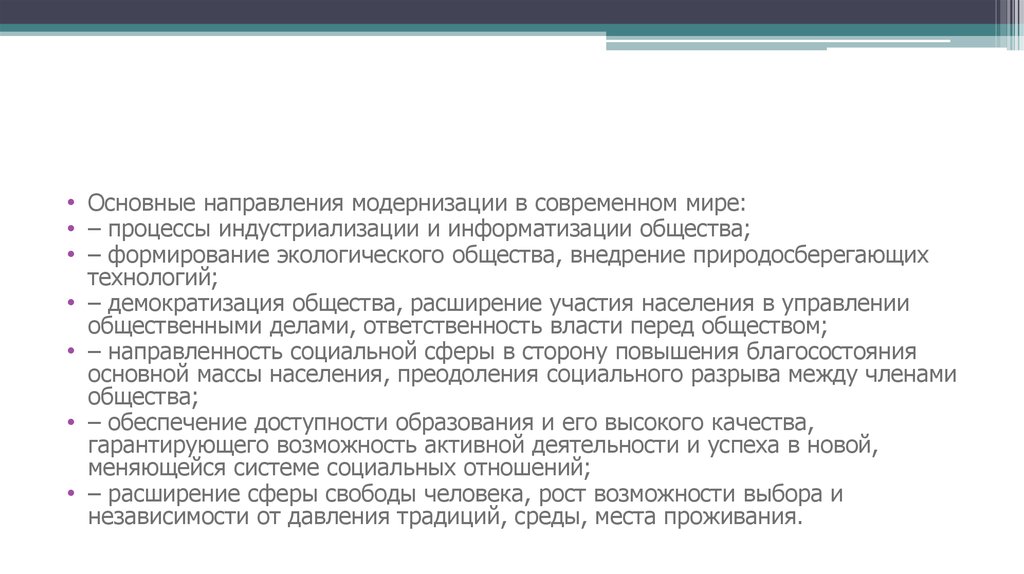 • Основные направления модернизации в современном мире:• – процессы индустриализации и информатизации общества;