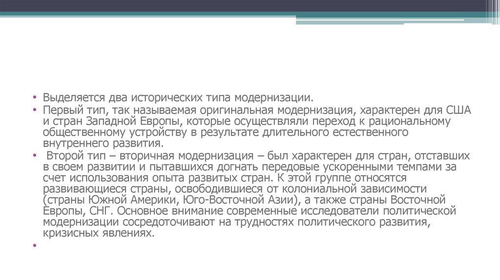 • Выделяется два исторических типа модернизации.• Первый тип, так называемая оригинальная модернизация, характерен для США