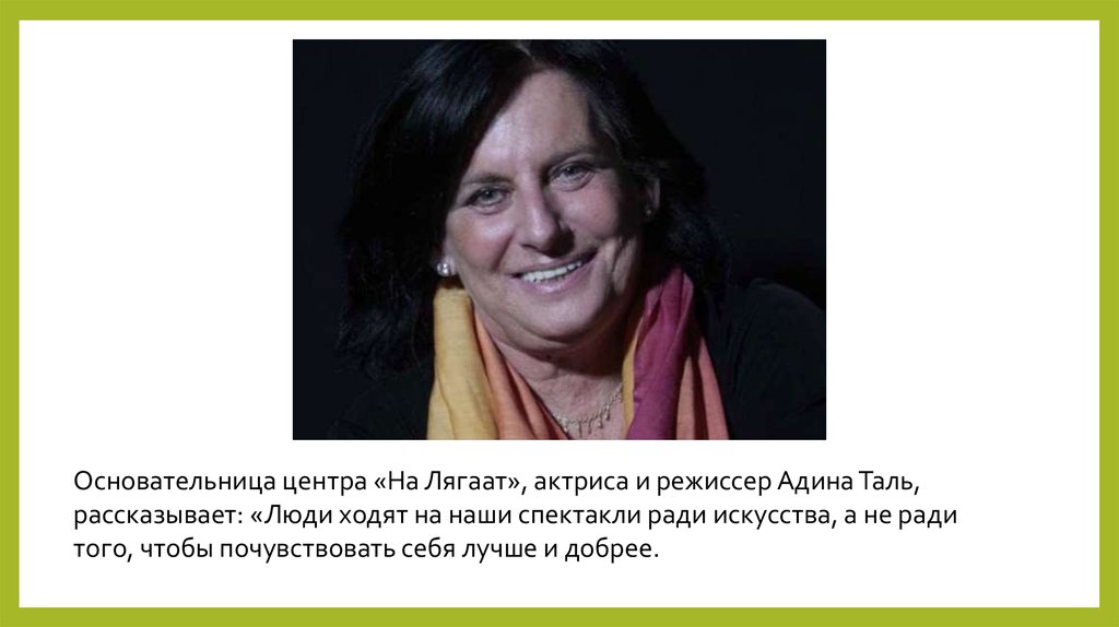 Основательница центра «На Лягаат», актриса и режиссер Адина Таль,рассказывает: «Люди ходят на наши спектакли ради искусства, а не ради