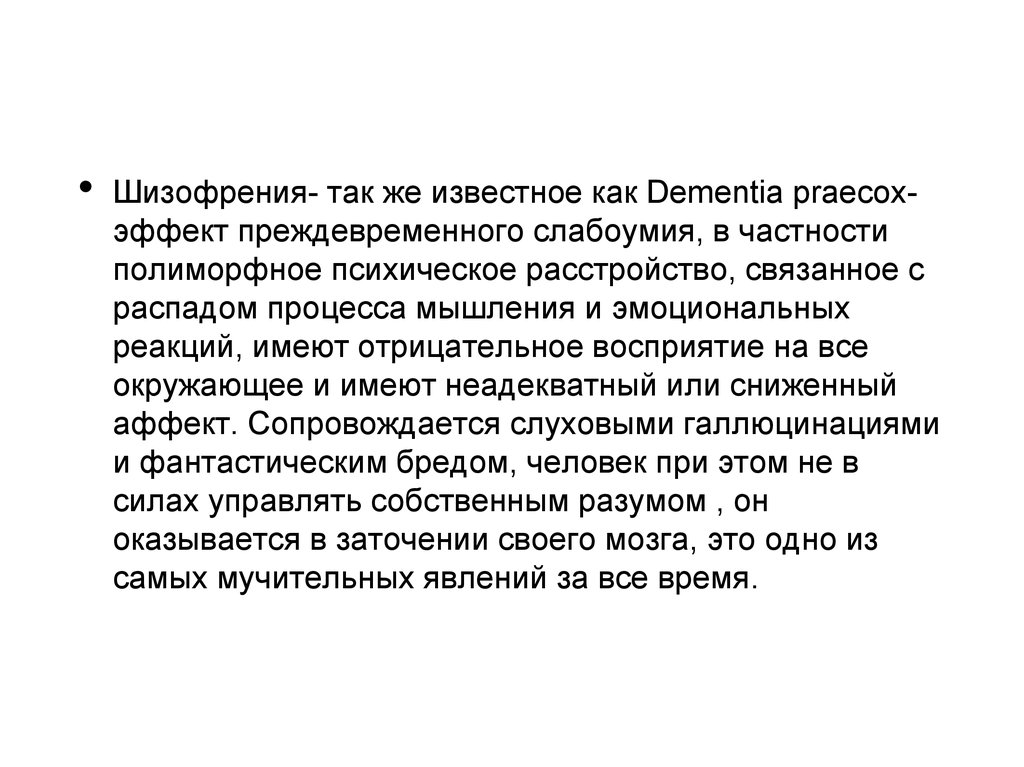 Шизофрения- так же известное как Dementia praecoxэффект преждевременного слабоумия, в частности
