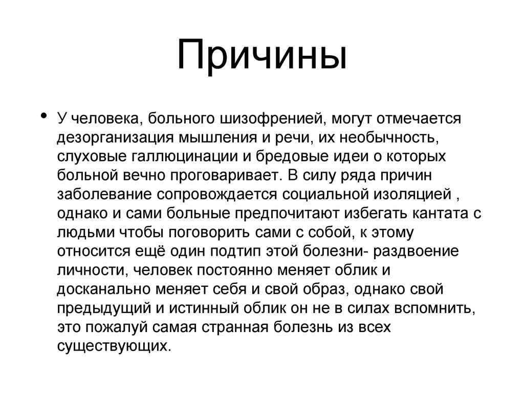 ПричиныУ человека, больного шизофренией, могут отмечается
