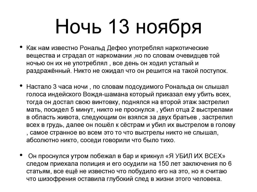 Ночь 13 ноябряКак нам известно Рональд Дефео употреблял наркотические