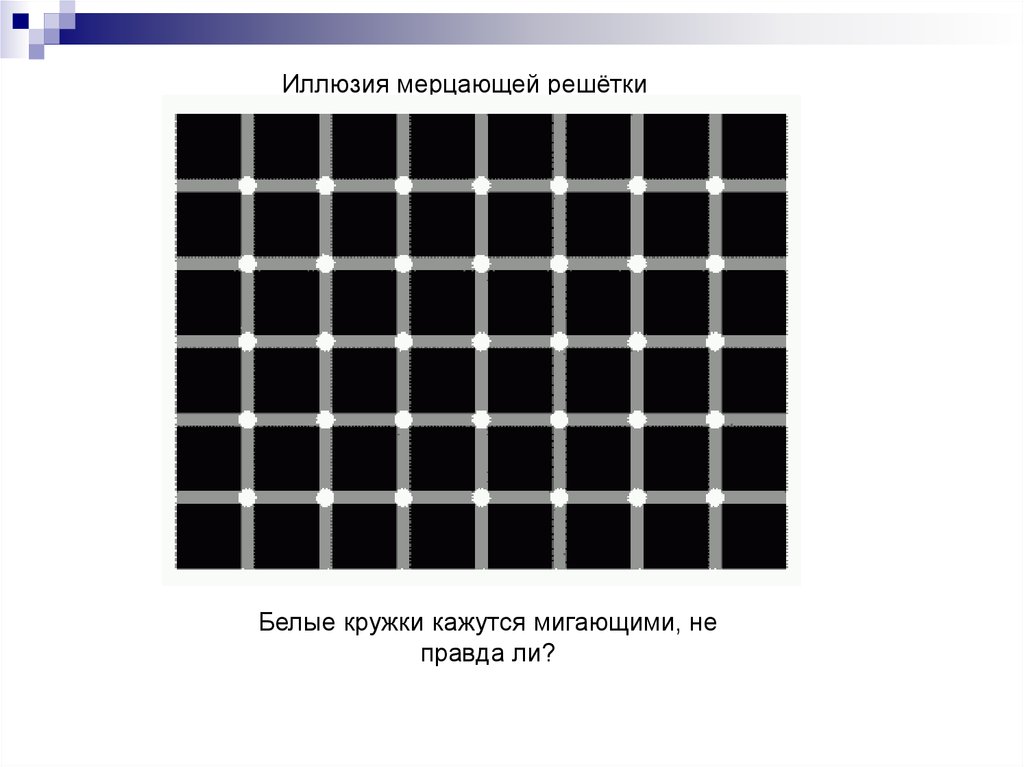 Иллюзия мерцающей решёткиБелые кружки кажутся мигающими, не