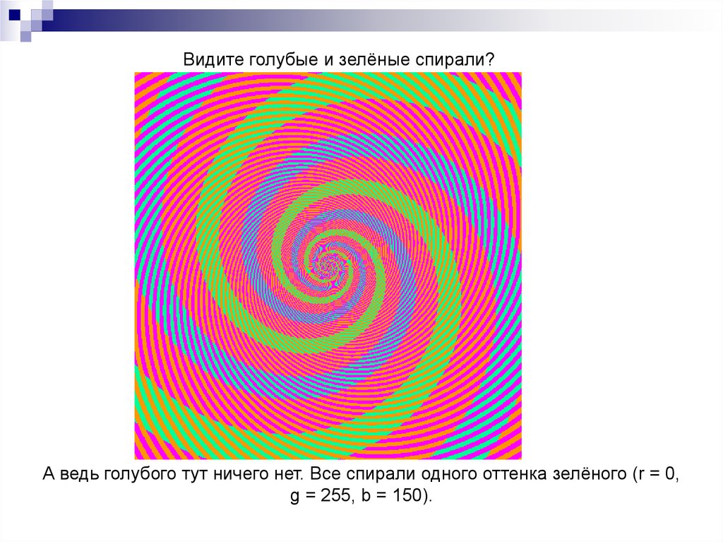 Видите голубые и зелёные спирали?А ведь голубого тут ничего нет. Все спирали одного оттенка зелёного (r = 0,
