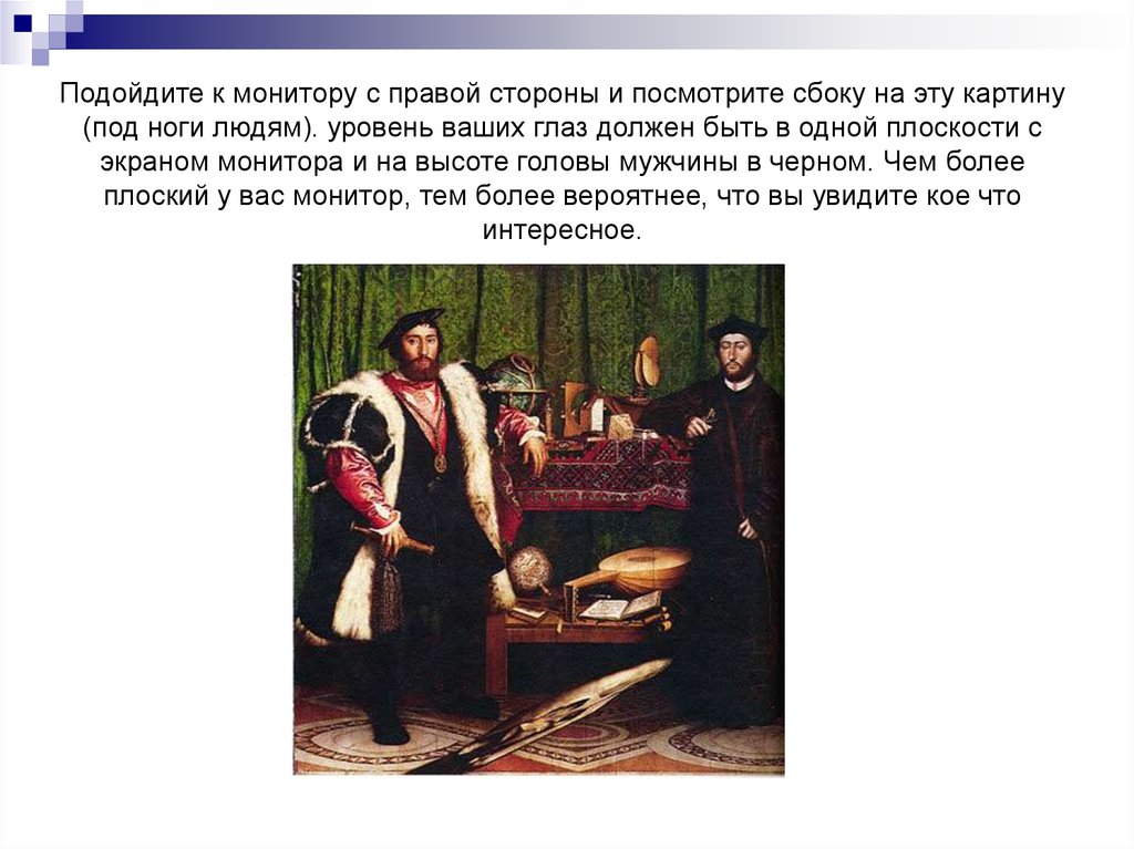 Подойдите к монитору с правой стороны и посмотрите сбоку на эту картину(под ноги людям). уровень ваших глаз должен быть в одной плоскости с