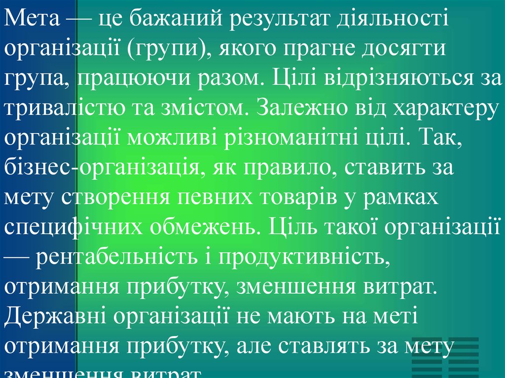 Мета — це бажаний результат діяльностіорганізації (групи), якого прагне досягти