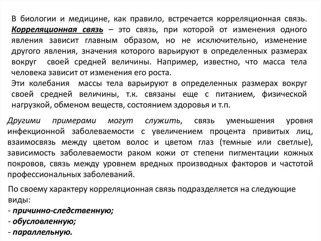 В биологии и медицине, как правило, встречается корреляционная связь.Корреляционная связь – это связь, при которой от изменения одного