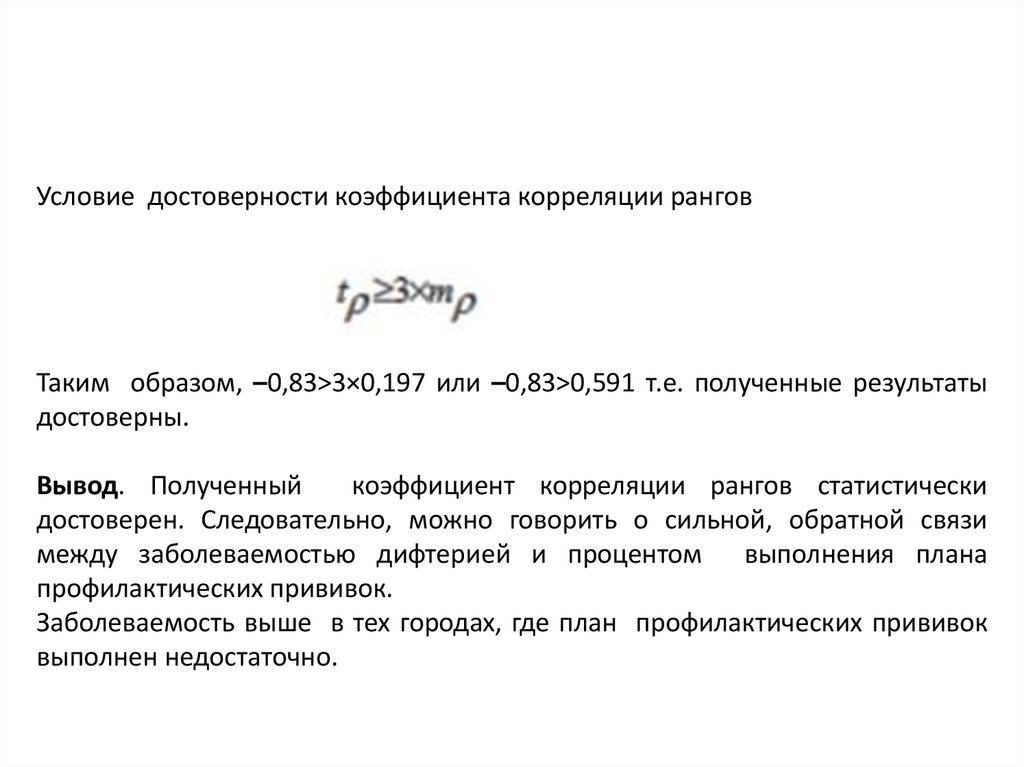 Условие достоверности коэффициента корреляции ранговТаким образом, –0,83>3×0,197 или –0,83>0,591 т.е. полученные результаты