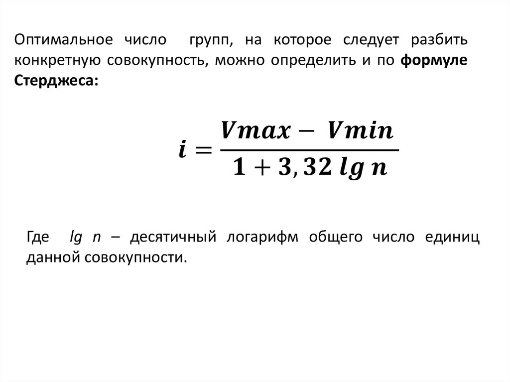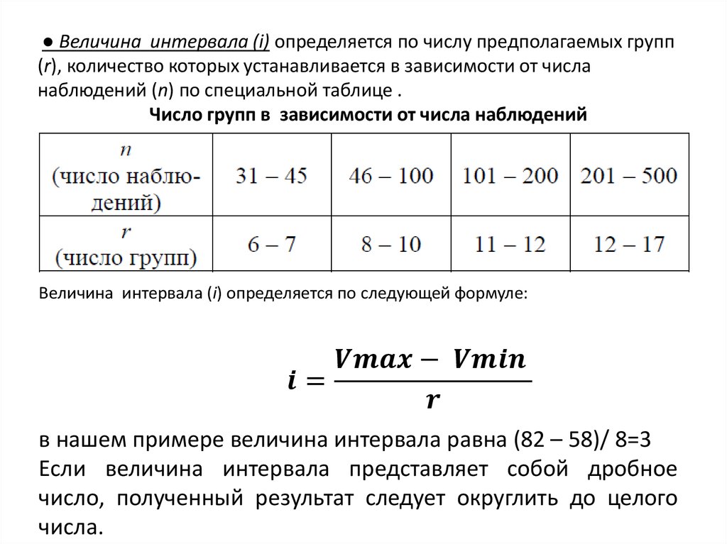 ● Величина интервала (i) определяется по числу предполагаемых групп(r), количество которых устанавливается в зависимости от числа