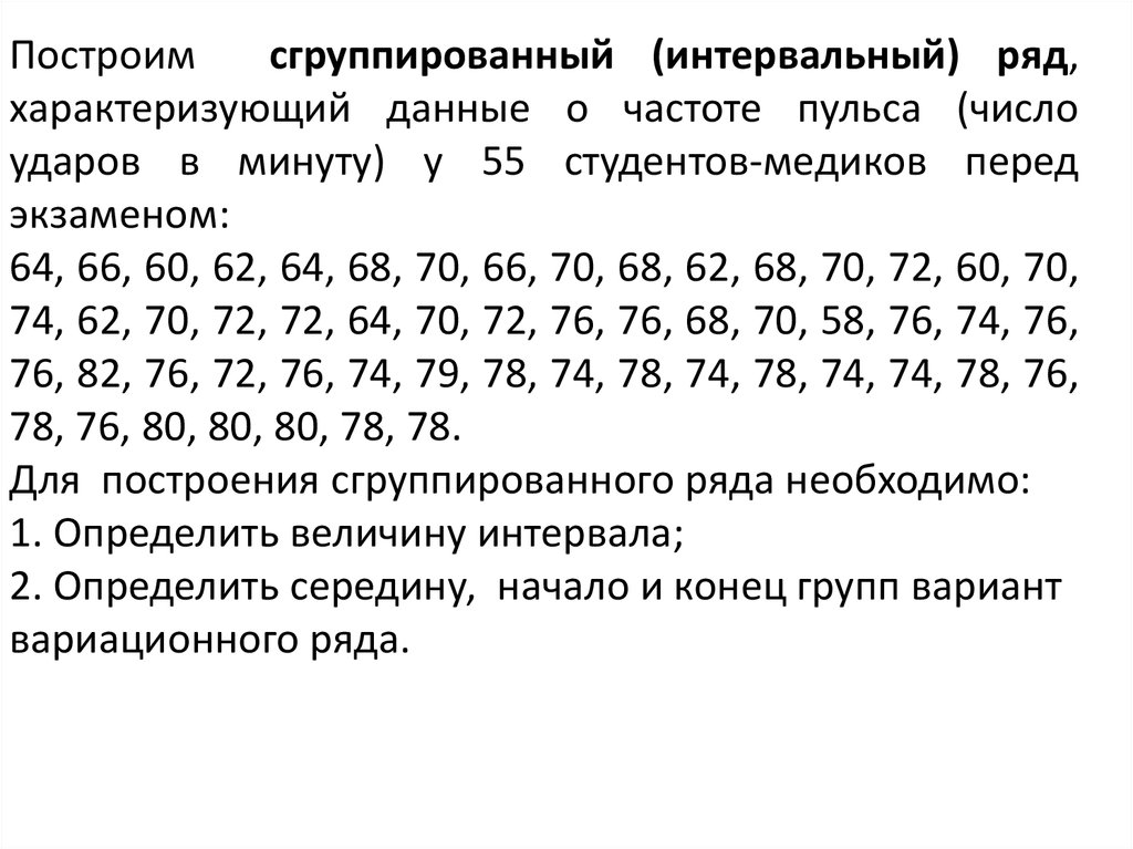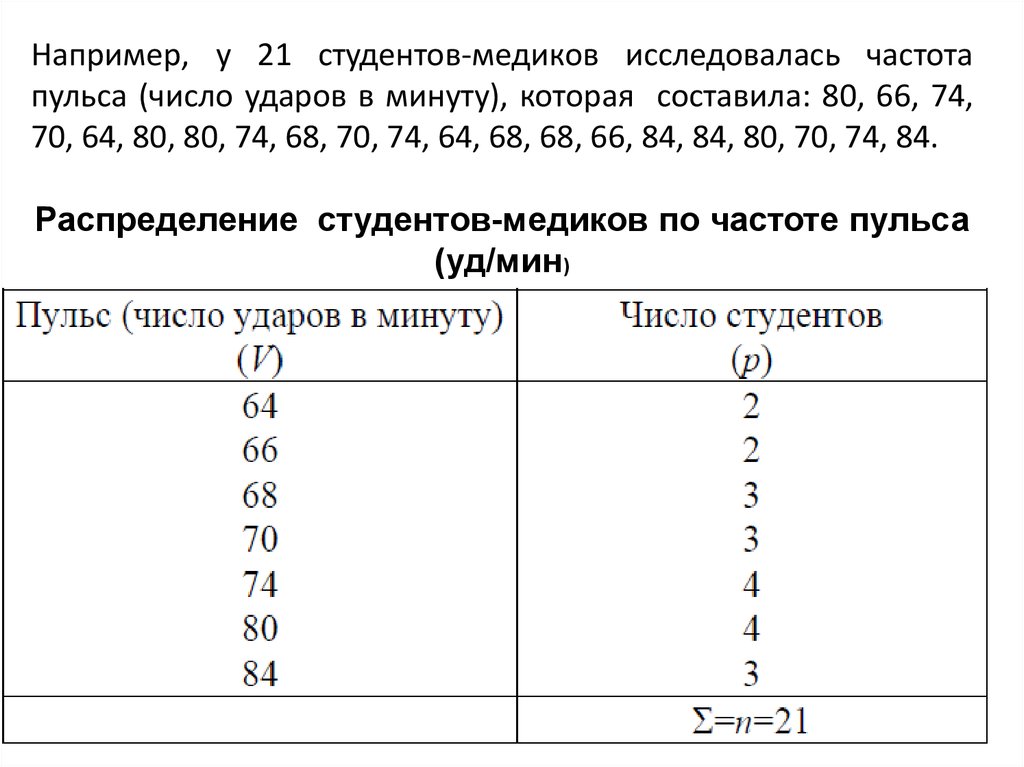 Например, у 21 студентов-медиков исследовалась частотапульса (число ударов в минуту), которая составила: 80, 66, 74,