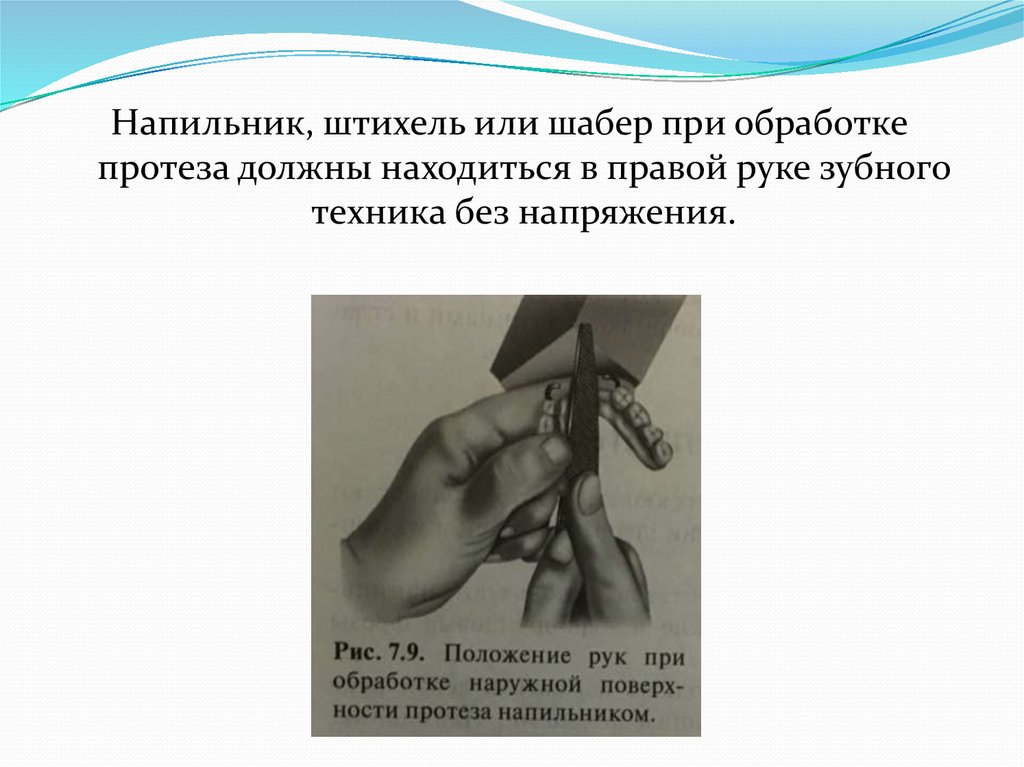 Напильник, штихель или шабер при обработкепротеза должны находиться в правой руке зубного