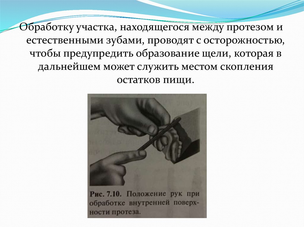 Обработку участка, находящегося между протезом иестественными зубами, проводят с осторожностью,