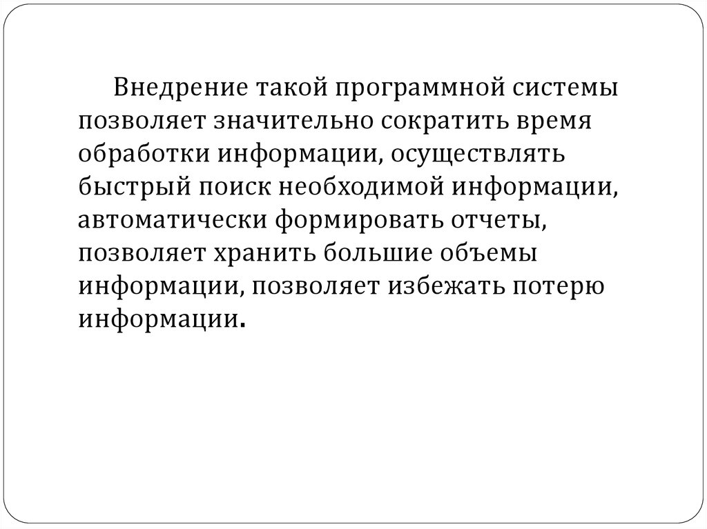 Внедрение такой программной системыпозволяет значительно сократить время