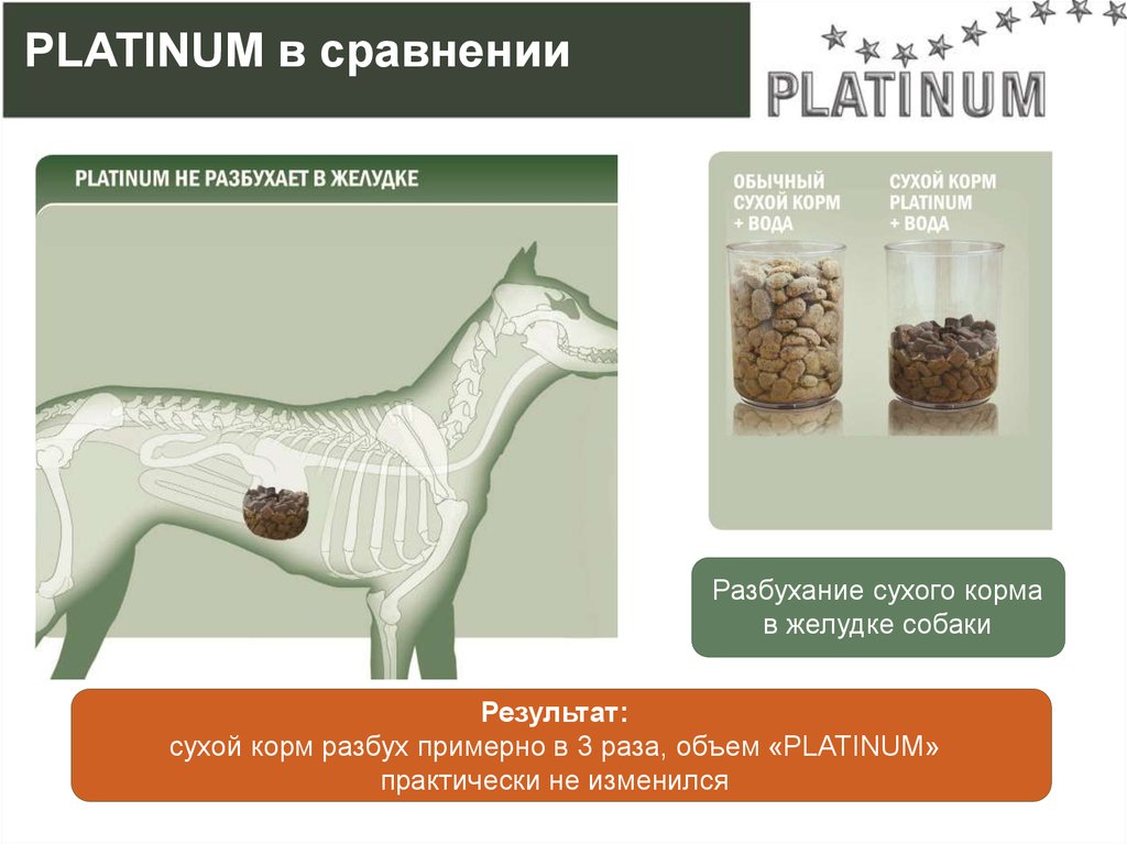сухой корм разбух примерно в 3 раза, объем «PLATINUM»
